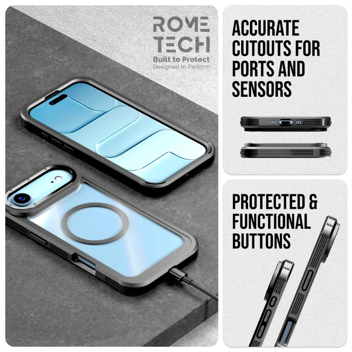 Protective Cases for Apple iPhone 17 Air a is four layers of 360-degree heavy-duty shockproof protection. Our defender case is made out of durable materials with a hard polycarbonate inner shell and soft outer rubber layer. Raised beveled edge keeps your touchscreen safe from scratches. A 360-degree swivel belt clip also functions as a kickstand with different viewing angles perfect for video calls and media playback. Defender case also have easy access to the charging port, buttons, sensors, and camera. Built-in port covers offer protection from dust, dirt, and other elements, making it ideal for commercial use. Rome Tech's Defender case multi-layer design offers rugged drop protection ideal for outdoor adventures, sports, hiking and guards your device against scrapes, bumps, dirt, and dust.