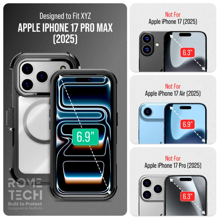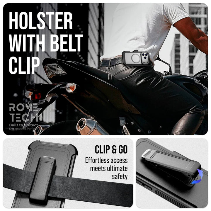 Protective Cases for Apple iPhone 17 Pro Max a is four layers of 360-degree heavy-duty shockproof protection. Our defender case is made out of durable materials with a hard polycarbonate inner shell and soft outer rubber layer. Raised beveled edge keeps your touchscreen safe from scratches. A 360-degree swivel belt clip also functions as a kickstand with different viewing angles perfect for video calls and media playback. Defender case also have easy access to the charging port, buttons, sensors, and camera. Built-in port covers offer protection from dust, dirt, and other elements, making it ideal for commercial use. Rome Tech's Defender case multi-layer design offers rugged drop protection ideal for outdoor adventures, sports, hiking and guards your device against scrapes, bumps, dirt, and dust.