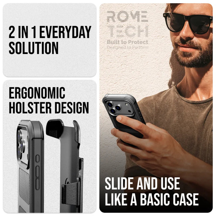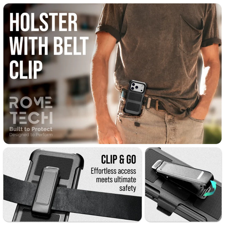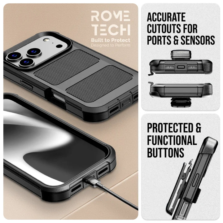 Protective Cases for Apple iPhone 17 Pro Max a is four layers of 360-degree heavy-duty shockproof protection. Our defender case is made out of durable materials with a hard polycarbonate inner shell and soft outer rubber layer. Raised beveled edge keeps your touchscreen safe from scratches. A 360-degree swivel belt clip also functions as a kickstand with different viewing angles perfect for video calls and media playback. Defender case also have easy access to the charging port, buttons, sensors, and camera. Built-in port covers offer protection from dust, dirt, and other elements, making it ideal for commercial use. Rome Tech's Defender case multi-layer design offers rugged drop protection ideal for outdoor adventures, sports, hiking and guards your device against scrapes, bumps, dirt, and dust.