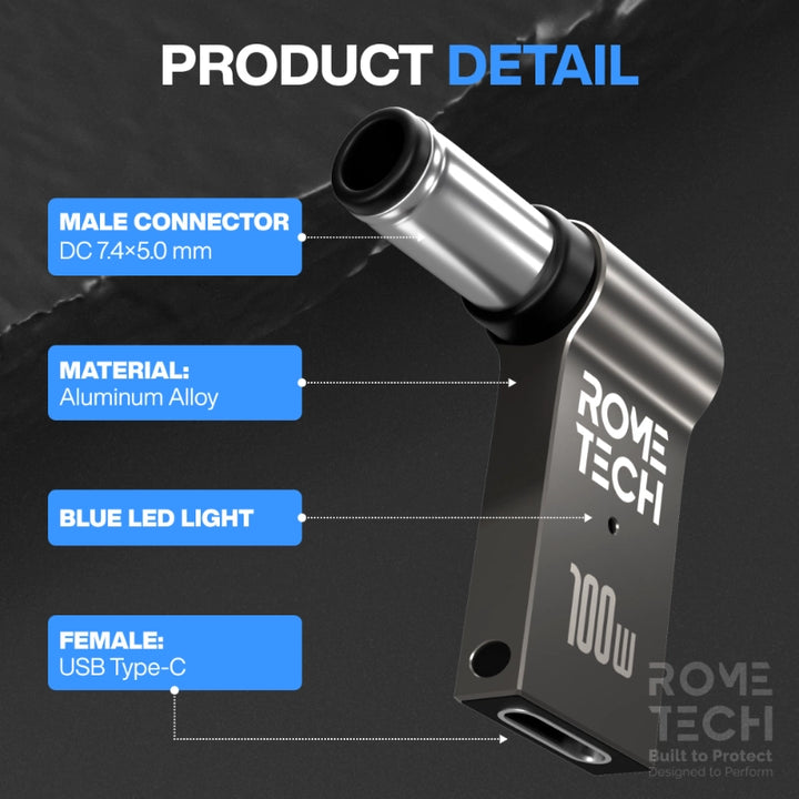 - USB Type-C to DC 7.4 x 5.0 mm Jack Plug Converter - Female USB Type-C to Male 7.4 x 5.0 mm. 100W connector plug that can connect laptop to a power delivery AC adapters, so you can use your power delivery charger cable with your laptop as well as your cell phone.