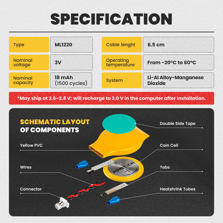Der Motherboard-Akku von Rome Tech eignet sich hervorragend zum Ersetzen eines leeren OEM-Akkus. Hochwertige Materialien und Verarbeitung garantieren eine lange Lebensdauer, auch unter extremen Bedingungen. Daher ist unser Akku eine ideale Wahl für Geräte, die eine zuverlässige und langlebige Stromquelle benötigen.